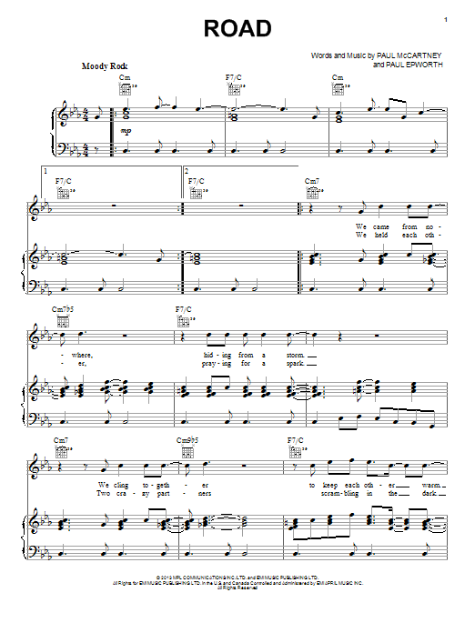 Download or print Paul McCartney Road sheet music, chords and digital score arranged for Piano, Vocal & Guitar Chords (Right-Hand Melody). This Pop score includes 8 page(s).