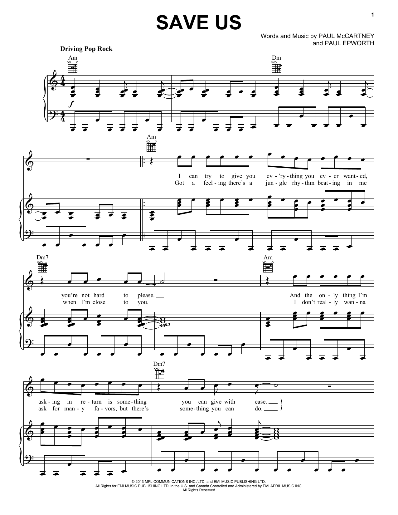 Download or print Paul McCartney Save Us sheet music, chords and digital score arranged for Easy Piano. This Pop score includes 4 page(s).