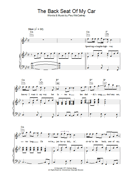 Download or print Paul McCartney The Back Seat Of My Car sheet music, chords and digital score arranged for Guitar Chords/Lyrics. This Rock score includes 3 page(s).