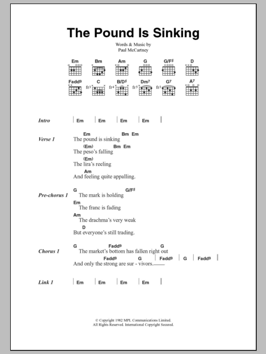 Download or print Paul McCartney The Pound Is Sinking sheet music, chords and digital score arranged for Guitar Chords/Lyrics. This Rock score includes 2 page(s).