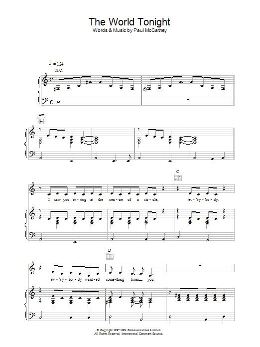 Download or print Paul McCartney The World Tonight sheet music, chords and digital score arranged for Piano, Vocal & Guitar Chords (Right-Hand Melody). This Pop score includes 5 page(s).