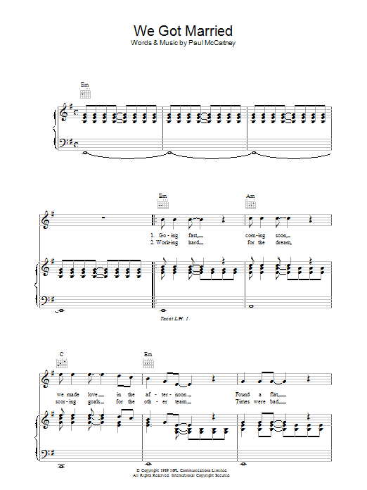 Download or print Paul McCartney We Got Married sheet music, chords and digital score arranged for Piano, Vocal & Guitar Chords. This Pop score includes 7 page(s).