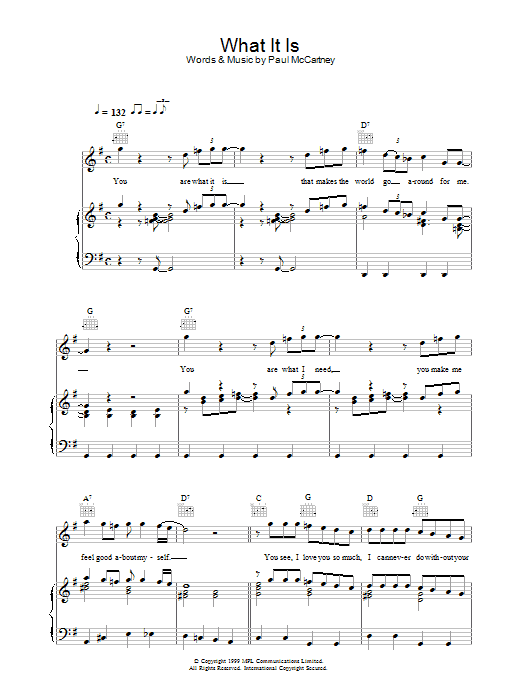 Download or print Paul McCartney What It Is sheet music, chords and digital score arranged for Piano, Vocal & Guitar Chords. This Pop score includes 5 page(s).