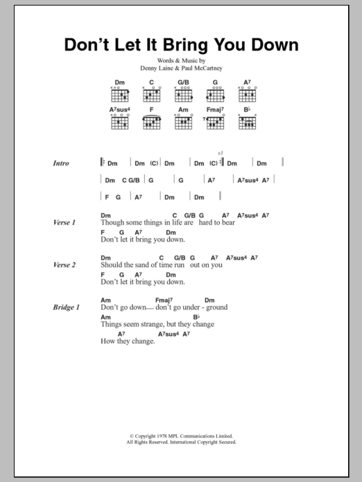 Download or print Paul McCartney & Wings Don't Let It Bring You Down sheet music, chords and digital score arranged for Guitar Chords/Lyrics. This Rock score includes 2 page(s).