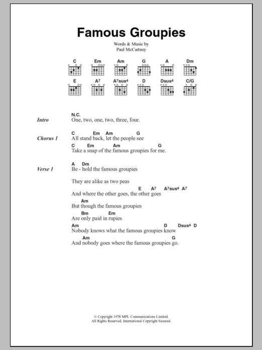 Download or print Paul McCartney & Wings Famous Groupies sheet music, chords and digital score arranged for Guitar Chords/Lyrics. This Rock score includes 3 page(s).
