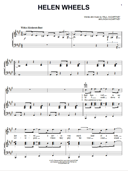 Download or print Paul McCartney & Wings Helen Wheels sheet music, chords and digital score arranged for Piano, Vocal & Guitar Chords (Right-Hand Melody). This Pop score includes 4 page(s).