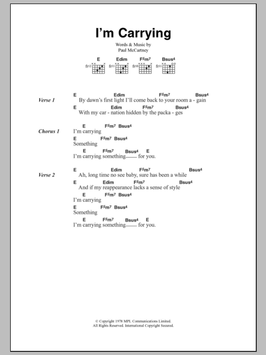Download or print Paul McCartney & Wings I'm Carrying sheet music, chords and digital score arranged for Guitar Chords/Lyrics. This Rock score includes 2 page(s).