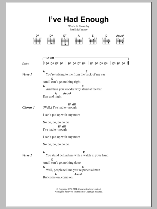 Download or print Paul McCartney & Wings I've Had Enough sheet music, chords and digital score arranged for Guitar Chords/Lyrics. This Rock score includes 2 page(s).
