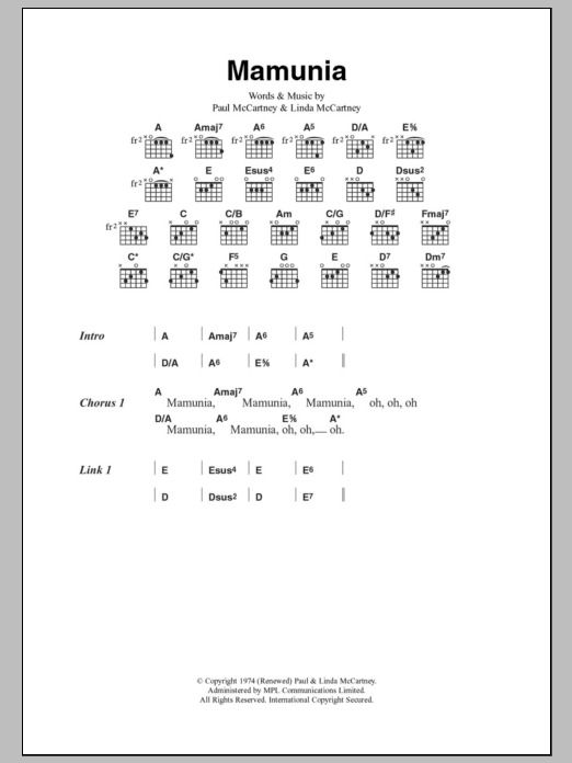 Download or print Paul McCartney & Wings Mamunia sheet music, chords and digital score arranged for Guitar Chords/Lyrics. This Rock score includes 3 page(s).