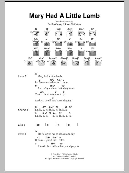 Download or print Paul McCartney & Wings Mary Had A Little Lamb sheet music, chords and digital score arranged for Guitar Chords/Lyrics. This Rock score includes 2 page(s).
