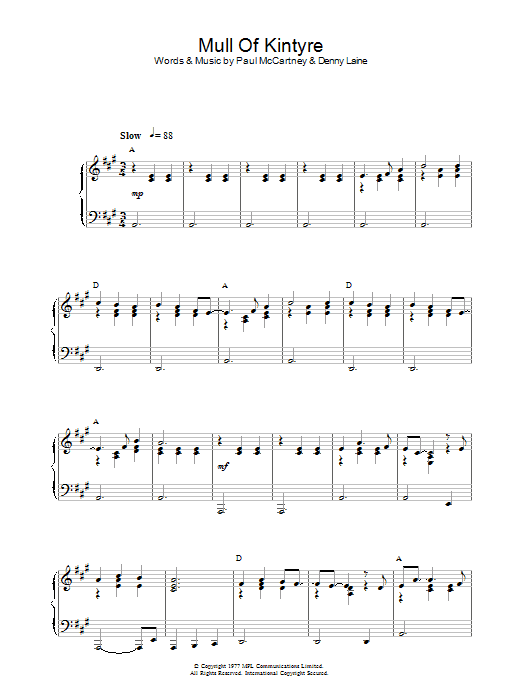 Download or print Paul McCartney Mull Of Kintyre sheet music, chords and digital score arranged for Piano Solo. This Pop score includes 3 page(s).