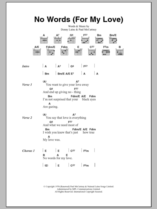 Download or print Paul McCartney & Wings No Words (For My Love) sheet music, chords and digital score arranged for Guitar Chords/Lyrics. This Rock score includes 2 page(s).