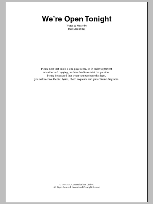 Download or print Paul McCartney & Wings We're Open Tonight sheet music, chords and digital score arranged for Guitar Chords/Lyrics. This Rock score includes 2 page(s).