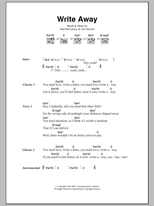 Download or print Paul McCartney Write Away sheet music, chords and digital score arranged for Guitar Chords/Lyrics. This Rock score includes 2 page(s).