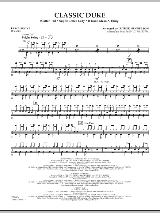 Download or print Paul Murtha Classic Duke - Percussion 1 sheet music, chords and digital score arranged for Concert Band. This Concert score includes 4 page(s).