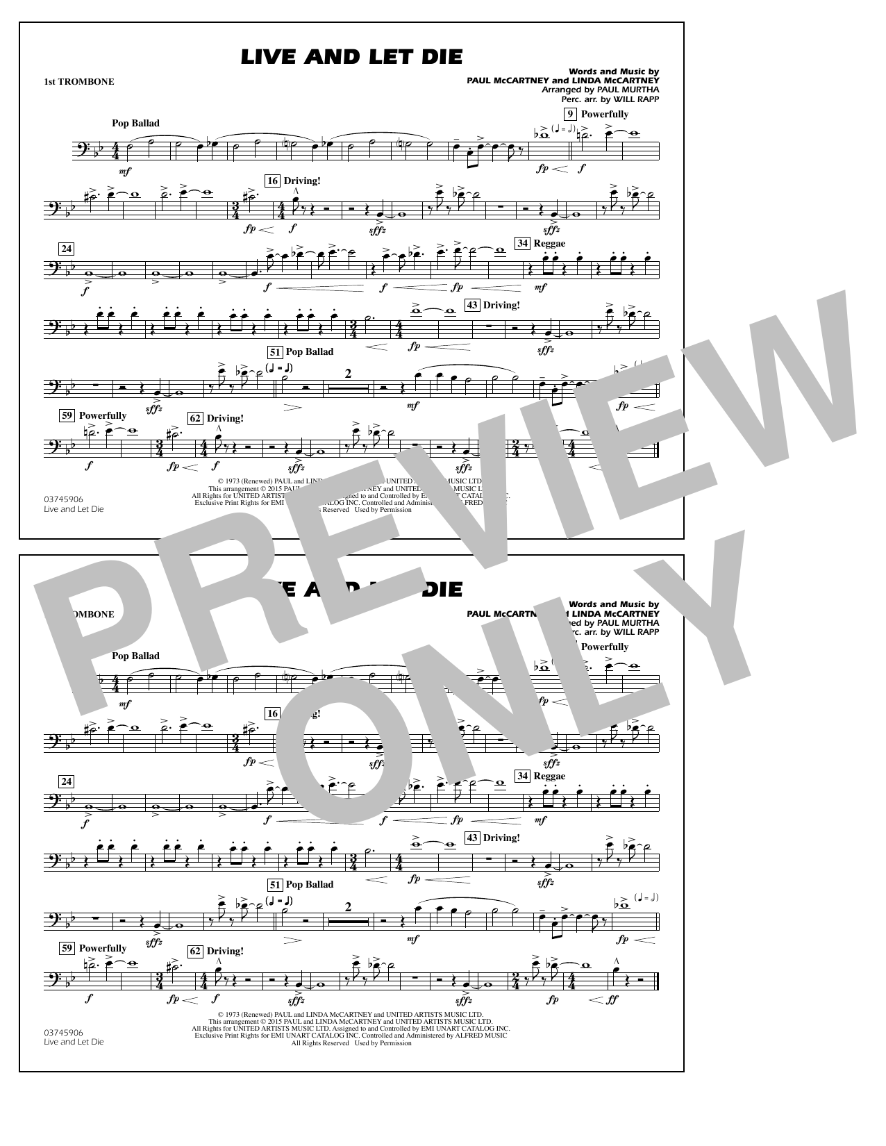 Download or print Paul Murtha Live and Let Die - 1st Trombone sheet music, chords and digital score arranged for Marching Band. This Pop score includes 1 page(s).