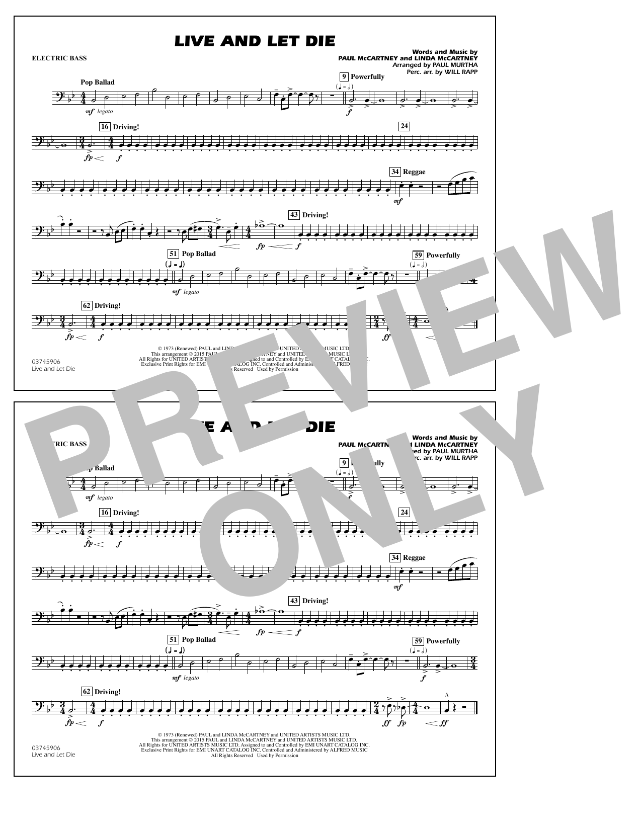 Download or print Paul Murtha Live and Let Die - Electric Bass sheet music, chords and digital score arranged for Marching Band. This Pop score includes 1 page(s).