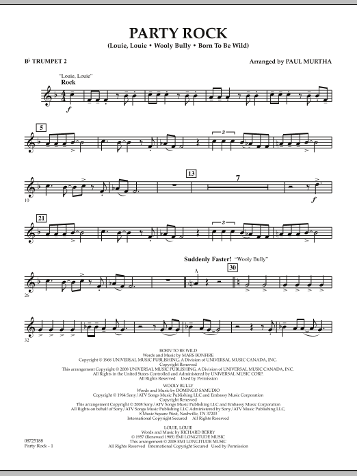 Download or print Paul Murtha Party Rock - Bb Trumpet 2 sheet music, chords and digital score arranged for Concert Band. This Rock score includes 2 page(s).