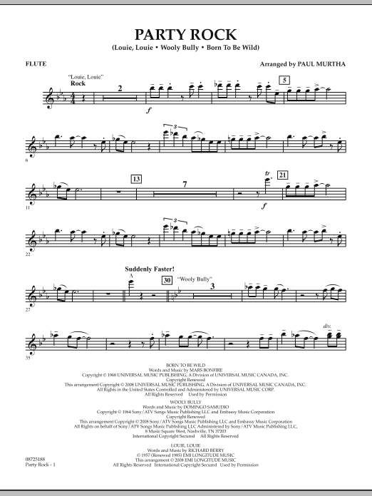 Download or print Paul Murtha Party Rock - Flute sheet music, chords and digital score arranged for Concert Band. This Rock score includes 2 page(s).