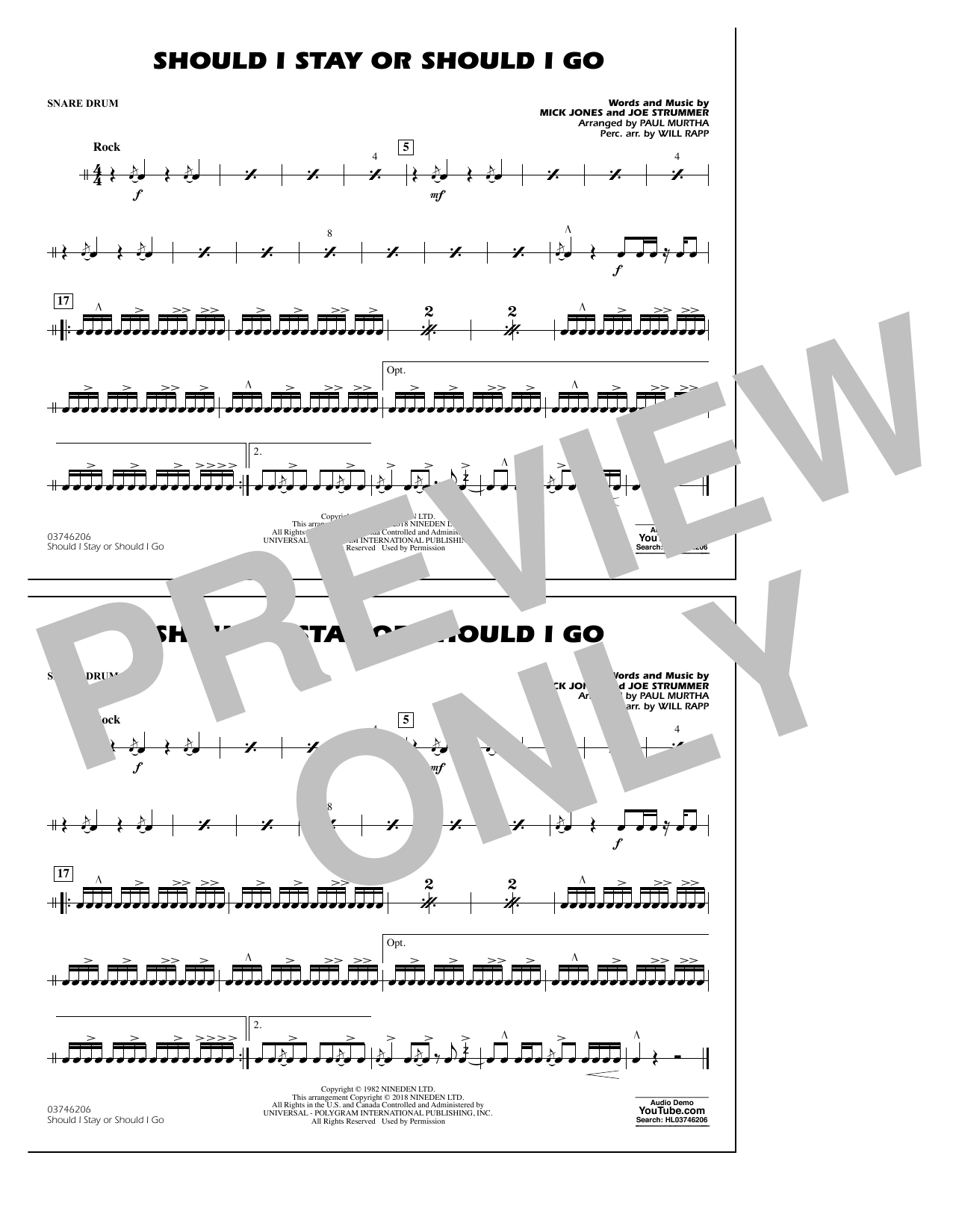 Download or print Paul Murtha Should I Stay Or Should I Go - Snare Drum sheet music, chords and digital score arranged for Marching Band. This Pop score includes 1 page(s).
