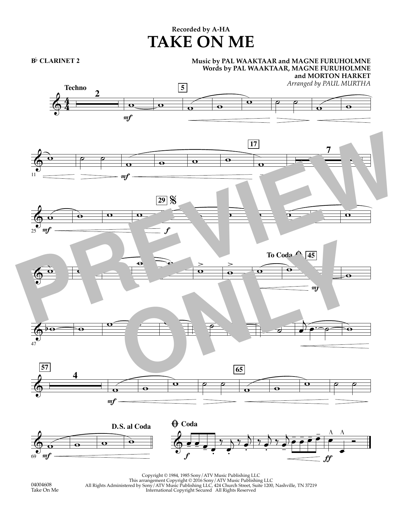 Download or print Paul Murtha Take on Me - Bb Clarinet 2 sheet music, chords and digital score arranged for Concert Band. This Pop score includes 1 page(s).
