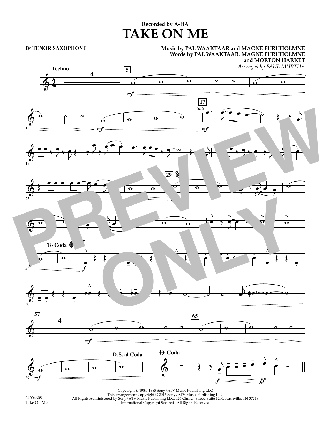 Download or print Paul Murtha Take on Me - Bb Tenor Saxophone sheet music, chords and digital score arranged for Concert Band. This Pop score includes 1 page(s).