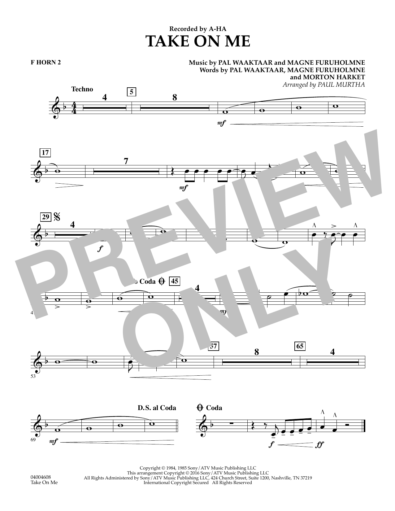 Download or print Paul Murtha Take on Me - F Horn 2 sheet music, chords and digital score arranged for Concert Band. This Pop score includes 1 page(s).