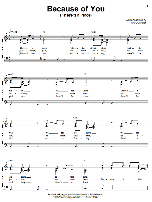 Download or print Paul Oakley Because Of You (There's A Place) sheet music, chords and digital score arranged for Piano, Vocal & Guitar Chords (Right-Hand Melody). This Christian score includes 3 page(s).