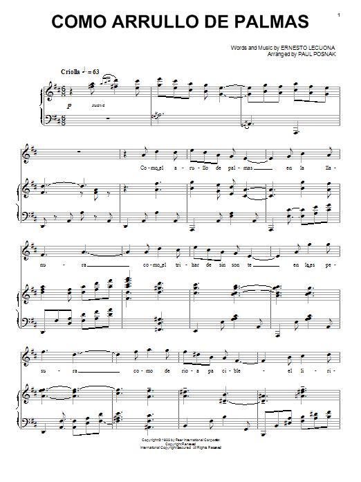 Download or print Paul Posnak Como Arrullo De Palmas sheet music, chords and digital score arranged for Piano & Vocal. This Jazz score includes 8 page(s).
