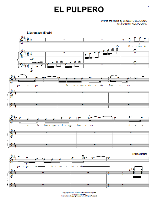 Download or print Paul Posnak El Pulpero sheet music, chords and digital score arranged for Piano & Vocal. This Jazz score includes 6 page(s).