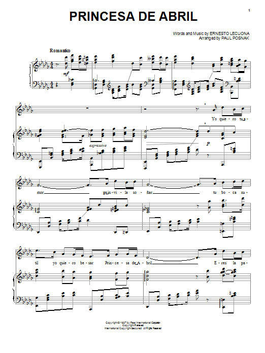 Download or print Paul Posnak Princesa De Abril sheet music, chords and digital score arranged for Piano & Vocal. This Jazz score includes 4 page(s).