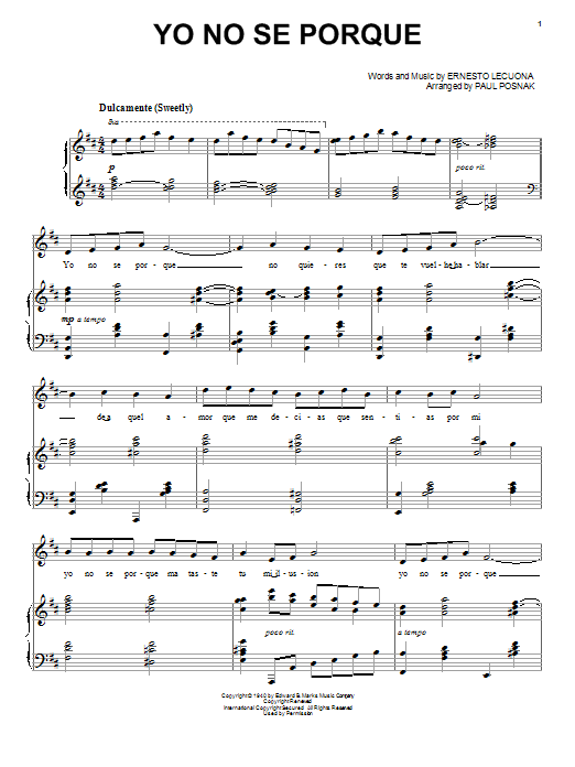 Download or print Paul Posnak Yo No Se Porque sheet music, chords and digital score arranged for Piano & Vocal. This Jazz score includes 8 page(s).