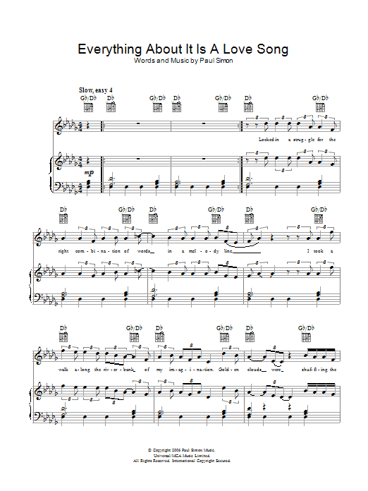 Download or print Paul Simon Everything About It Is A Love Song sheet music, chords and digital score arranged for Piano, Vocal & Guitar Chords. This Folk score includes 7 page(s).