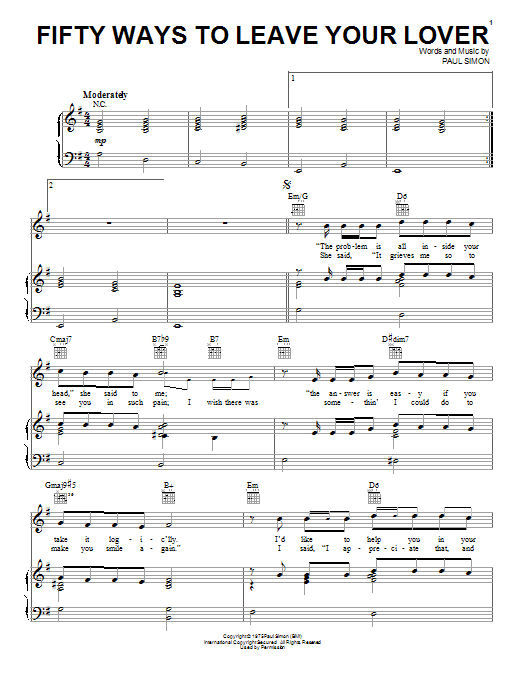 Download or print Paul Simon Fifty Ways To Leave Your Lover sheet music, chords and digital score arranged for Piano, Vocal & Guitar Chords (Right-Hand Melody). This Folk score includes 4 page(s).
