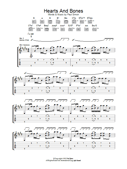 Download or print Paul Simon Hearts And Bones sheet music, chords and digital score arranged for Piano Chords/Lyrics. This Folk score includes 4 page(s).