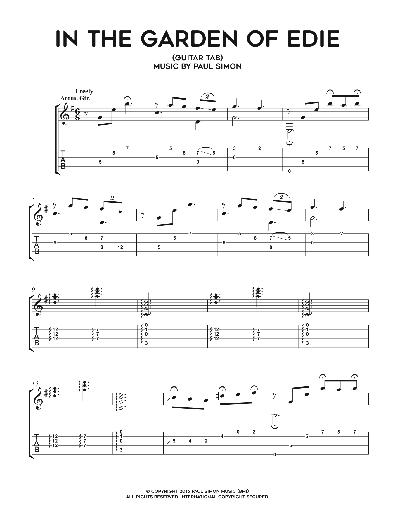 Download or print Paul Simon In The Garden Of Edie sheet music, chords and digital score arranged for Guitar Tab. This Folk score includes 2 page(s).