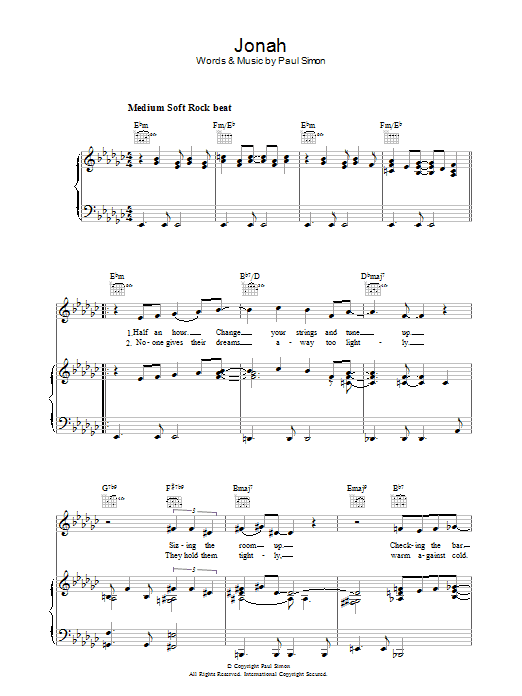 Download or print Paul Simon Jonah sheet music, chords and digital score arranged for Piano, Vocal & Guitar Chords. This Folk score includes 6 page(s).