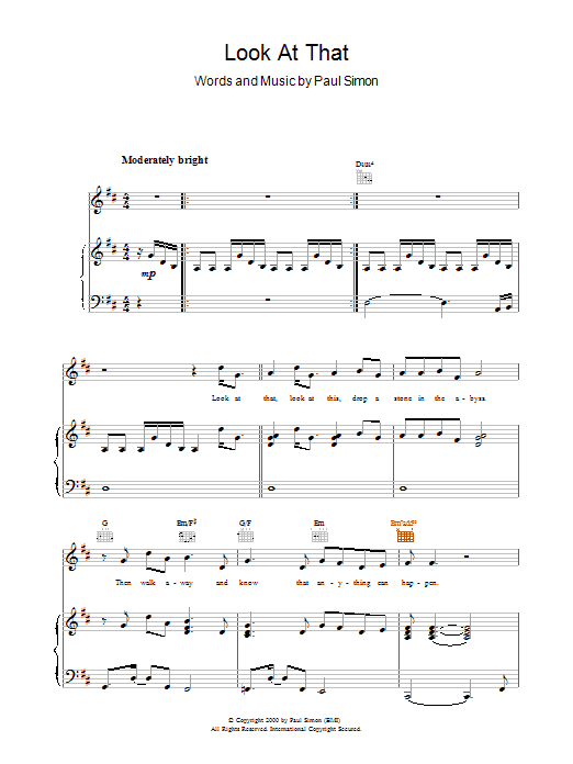 Download or print Paul Simon Look At That sheet music, chords and digital score arranged for Piano, Vocal & Guitar Chords. This Folk score includes 8 page(s).