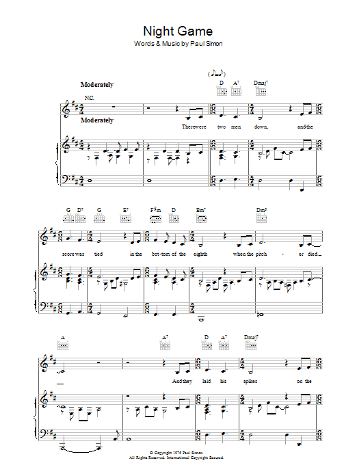 Download or print Paul Simon Night Game sheet music, chords and digital score arranged for Piano, Vocal & Guitar Chords. This Folk score includes 4 page(s).