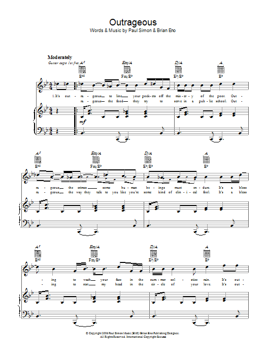 Download or print Paul Simon Outrageous sheet music, chords and digital score arranged for Piano, Vocal & Guitar Chords. This Folk score includes 7 page(s).