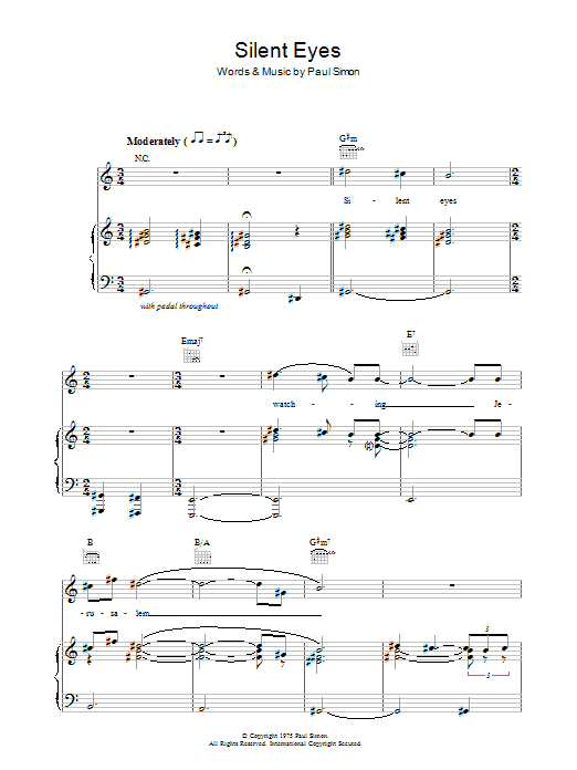 Download or print Paul Simon Silent Eyes sheet music, chords and digital score arranged for Piano, Vocal & Guitar Chords. This Folk score includes 9 page(s).