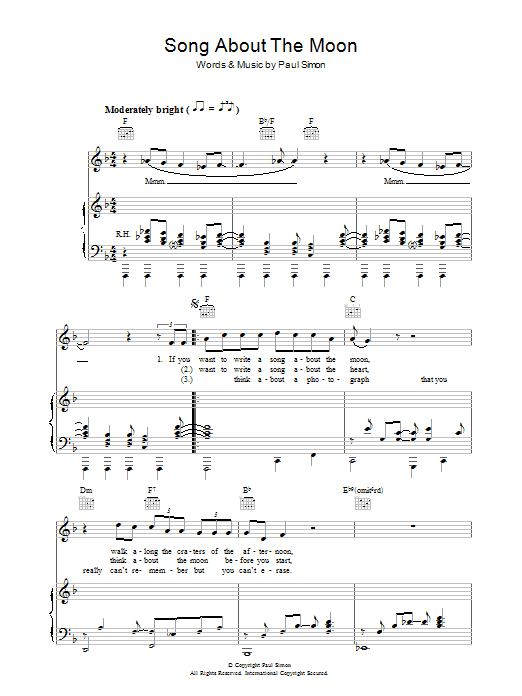 Download or print Paul Simon Song About The Moon sheet music, chords and digital score arranged for Guitar Chords/Lyrics. This Pop score includes 3 page(s).