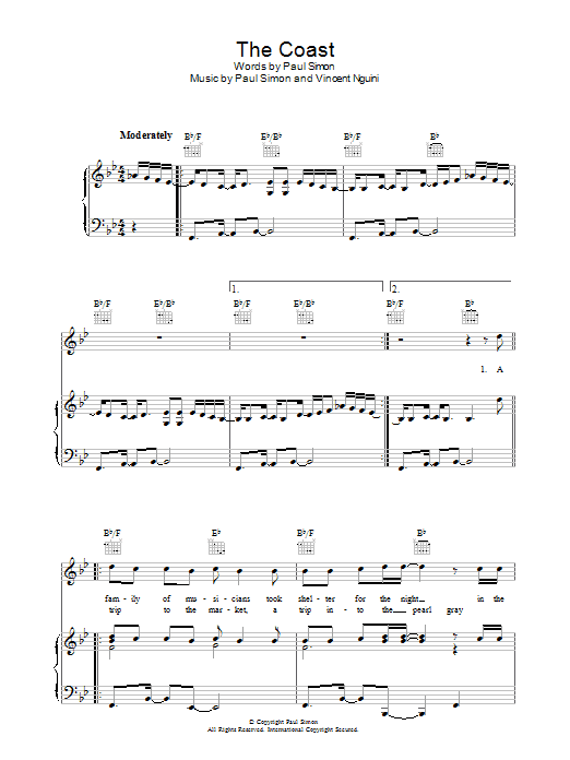 Download or print Paul Simon The Coast sheet music, chords and digital score arranged for Piano, Vocal & Guitar Chords. This Pop score includes 11 page(s).
