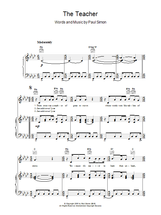 Download or print Paul Simon The Teacher sheet music, chords and digital score arranged for Piano, Vocal & Guitar Chords. This World score includes 5 page(s).