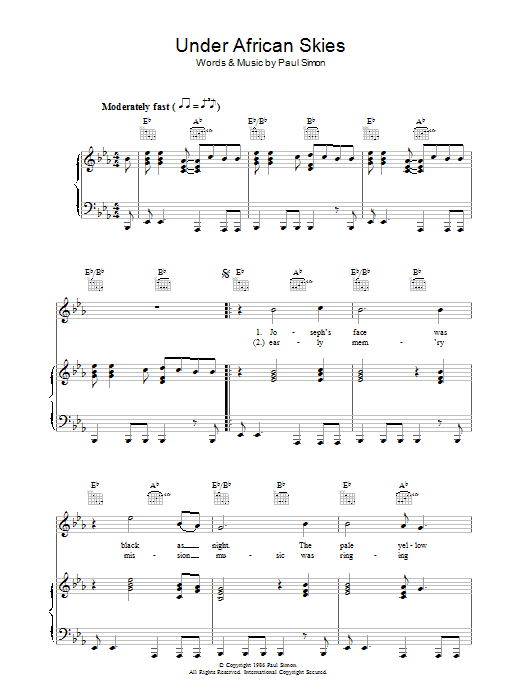 Download or print Paul Simon Under African Skies sheet music, chords and digital score arranged for Guitar Chords/Lyrics. This Pop score includes 2 page(s).