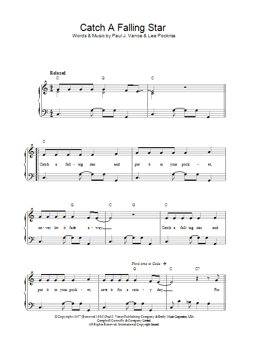 Download or print Paul Vance Catch A Falling Star sheet music, chords and digital score arranged for Easy Piano. This Pop score includes 2 page(s).