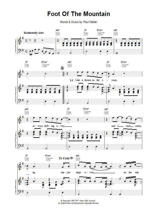 Download or print Paul Weller Foot Of The Mountain sheet music, chords and digital score arranged for Guitar Chords/Lyrics. This Rock score includes 2 page(s).