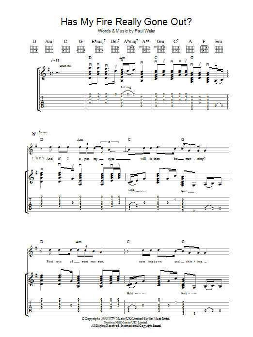 Download or print Paul Weller Has My Fire Really Gone Out? sheet music, chords and digital score arranged for Guitar Tab. This Rock score includes 9 page(s).