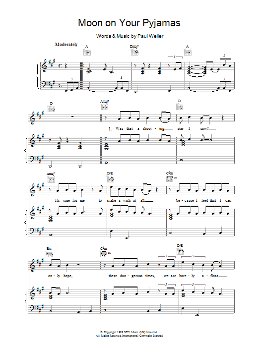 Download or print Paul Weller Moon on Your Pyjamas sheet music, chords and digital score arranged for Piano, Vocal & Guitar Chords. This Pop score includes 4 page(s).