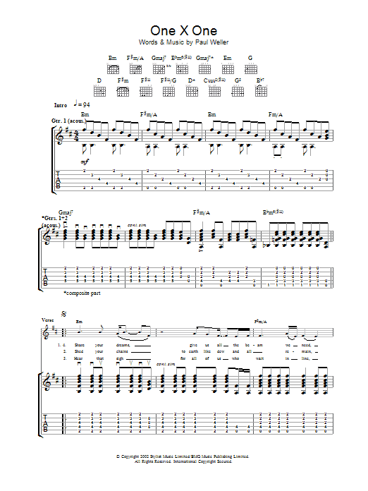 Download or print Paul Weller One X One sheet music, chords and digital score arranged for Guitar Tab. This Pop score includes 8 page(s).